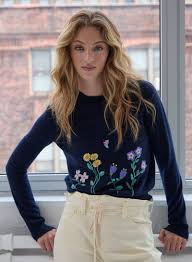 Autumn Cashmere Spring Flowers Embroidered Crew - Navy