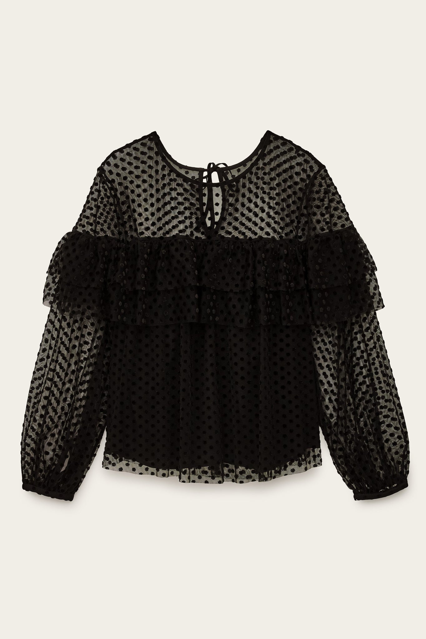 Sheer dotted Swiss style fishnet fabric - Round neckline - Opening and string in back - Worn frontwards or backwards - Loose and flowing - Seam detail with two frills along the sleeve just above the chest - Layered style look - 3 buttons on the bottom of the sleeves - Charming 70s bohemian style