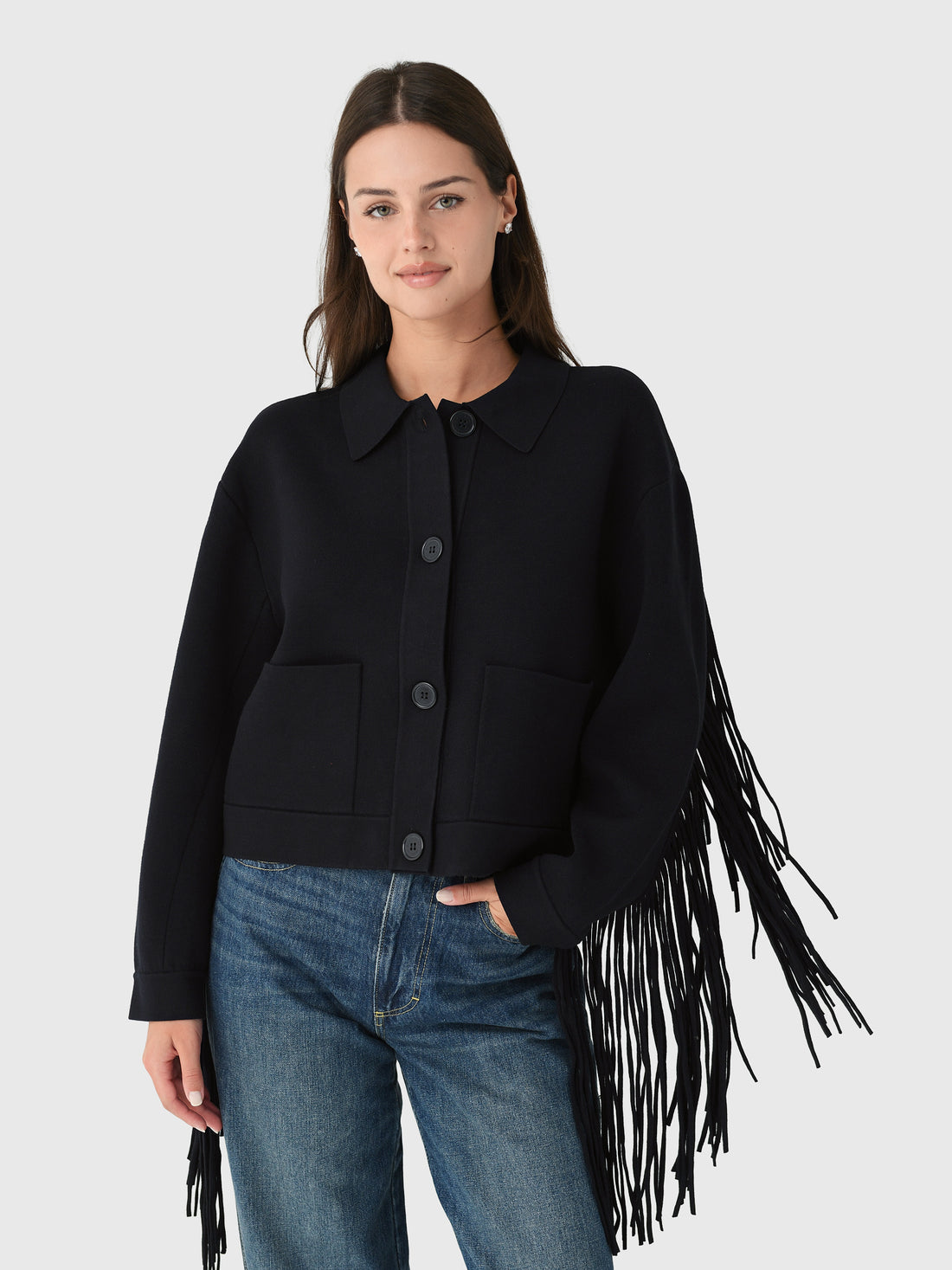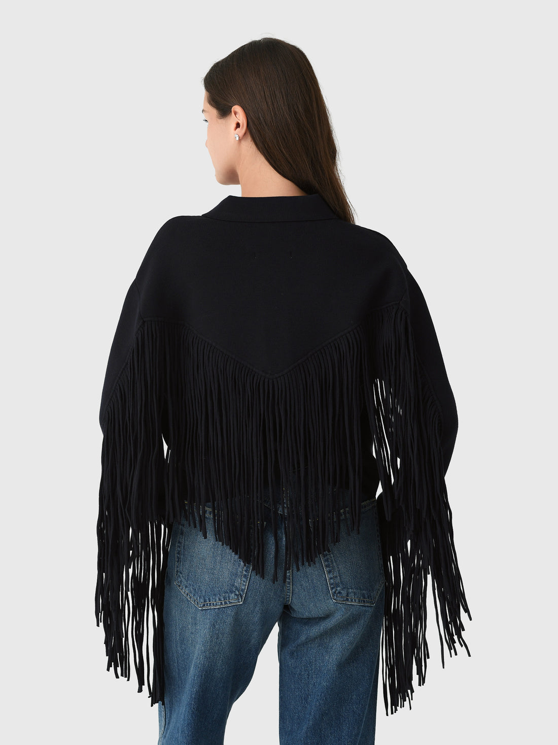 This jacket has a relaxed-fit silhouette, enhanced by dropped shoulders and a cropped hem. It features two patch pockets and tonal button fastenings. The fringe detailing on the back adds a playful sense of movement and fluidity, bringing a unique finish to this stylish jacket.