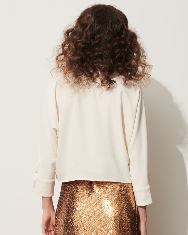 Made up in a luxe matte crepe, this elegant wrap-style surplice top features a dolman sleeve, covered button cuff detail at the bracelet length sleeve, and a draped, cowl-like neckline.