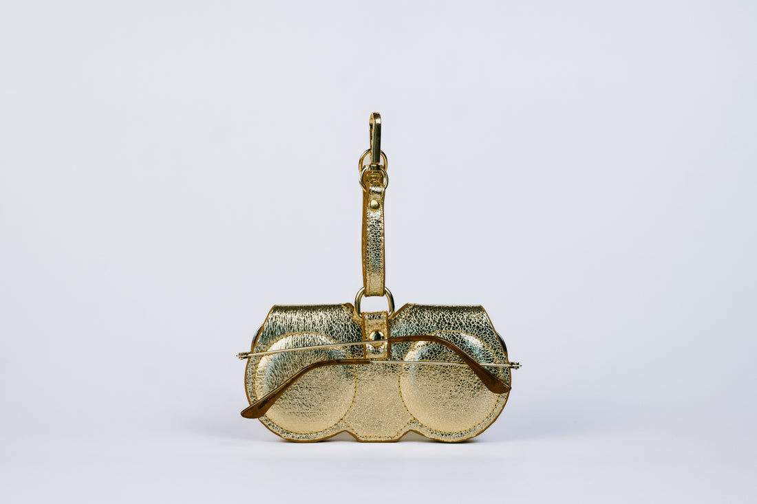 This hand-crafted eyewear case, the GLASS HOUSE CASE in Crackled Gold, boasts genuine leather and a timeless design. With expert craftsmanship, this case ensures secure and stylish protection for your eyewear. the glass house: a must-have accessory for any fashionable eyewear enthusiast.
