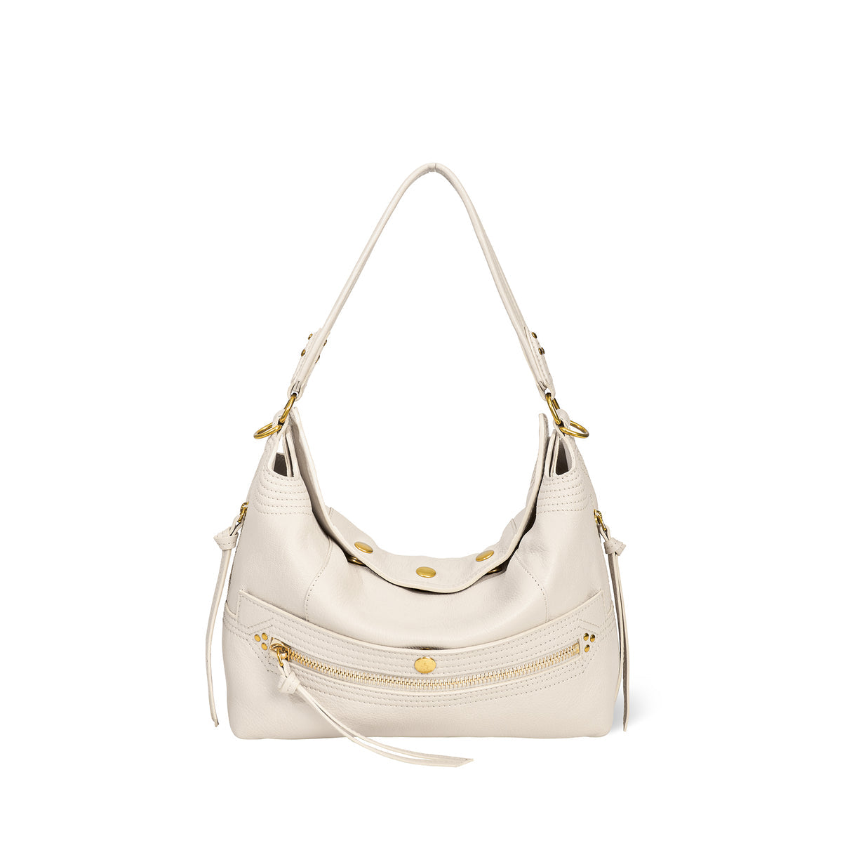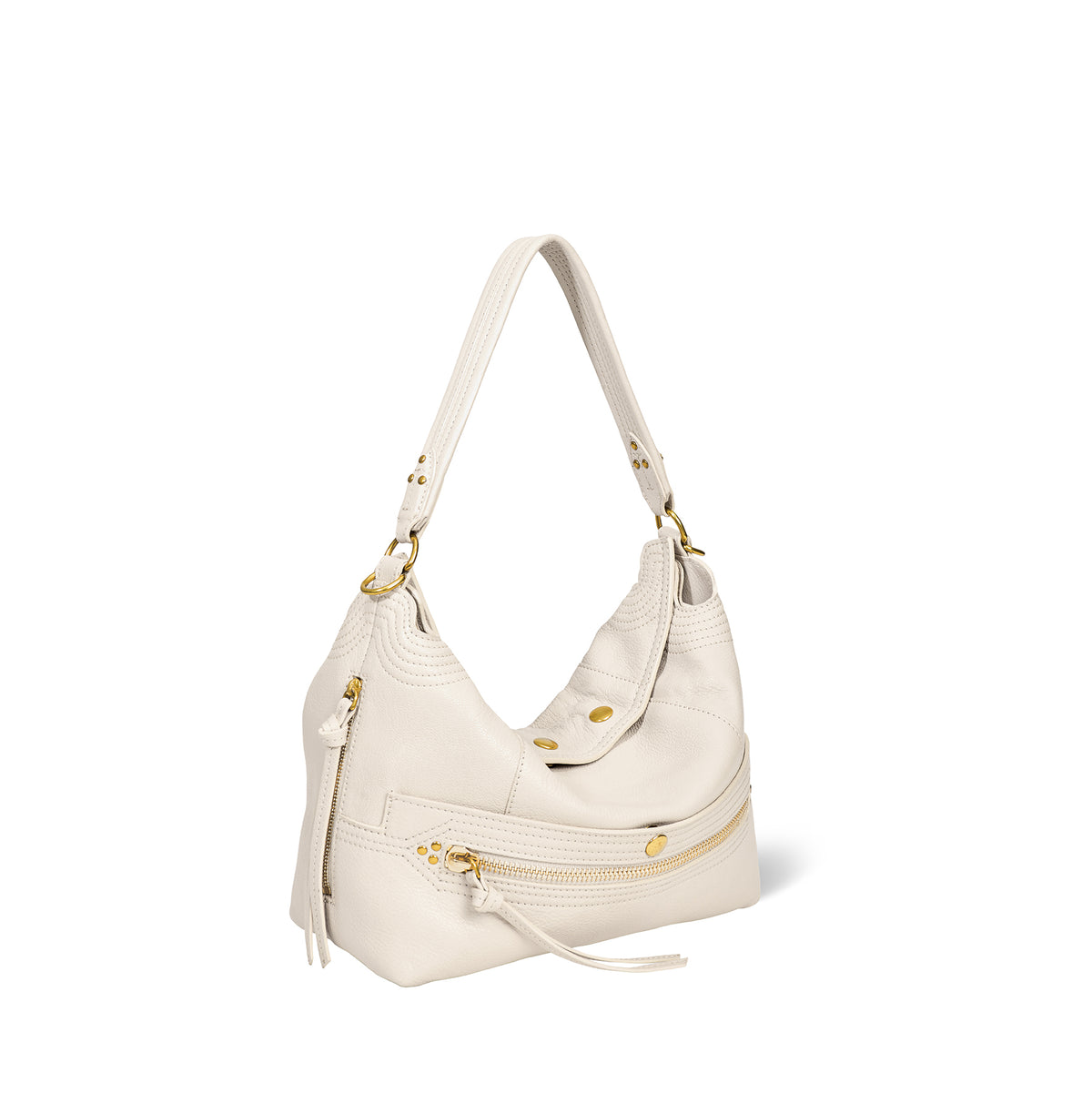 Baguette hobo bag, worn over the shoulder or crossbody with its strap. Removable shoulder strap, zip closure with leather ties and snap button.Exterior: 3 zippered pockets and 1 flat pocket. Interior: 1 flat pocket and 1 zippered pocket. Handles with a length of 36 cm, non-adjustable removable shoulder strap of 100 cm. Compatible with all straps.