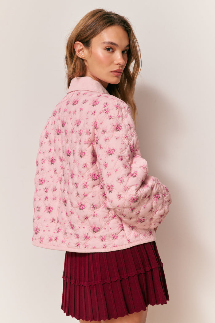 The Quinlette Jacket brings cozy charm to your outerwear rotation with a nod to classic New England style. Crafted in printed Nordic nylon and quilted in a delicate lattice-bow pattern, this medium-weight puffer channels the spirit of vintage hunting jackets with a romantic twist. Slightly boxy and hitting at the hip, it features a corduroy collar, cinched elastic sleeves, and practical waist pockets for warmth and ease. Perfect for crisp fall days, Quinlette blends effortless utility with whimsical LoveShackFancy detailing.