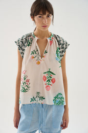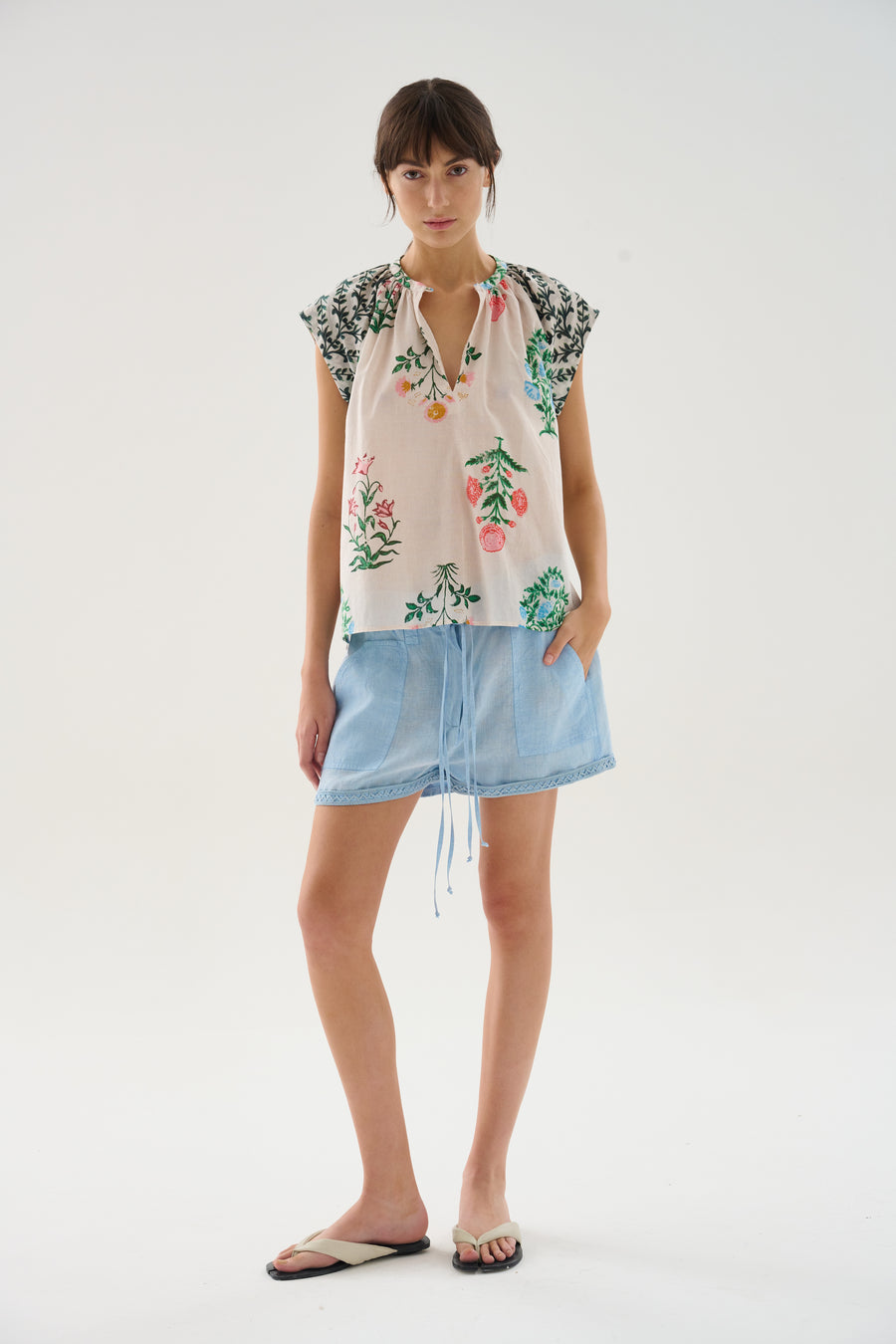 The Keyla Top is crafted from lightweight cotton voile. Soft gathers along the neckline create a subtle drape, while the open V-front detail adds a touch of relaxed elegance.