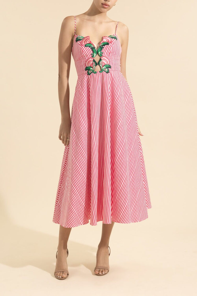 The Jana-B Dress is a playful cotton midi dress that balances ease with refinement. The V-neckline is framed by colorful Fan Flower appliqué embroidery intertwined with eye-catching cut-out details. A flared skirt drapes into a beautiful, subtly bell-like shape that contrasts with the fitted bodice and adds subtle movement.