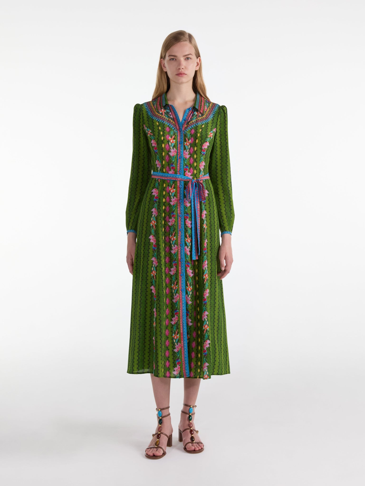 The Vanessa-B Dress is a signature SALONI SHAPE designed to provide effortless elegance for any occasion. This refined princess-line shirt dress features a classic collar at the neck and long sleeves finished with a soft puff at the cuffs, adding a subtle, feminine touch. The Parterre Flora print showcases delicate pink and orange flowers intertwined with jewelled stripes set against a green patterned base. Perfectly balancing timeless details and contemporary lines, the Vanessa-B Dress is a versatile wardrobe essential to reach for time and again.