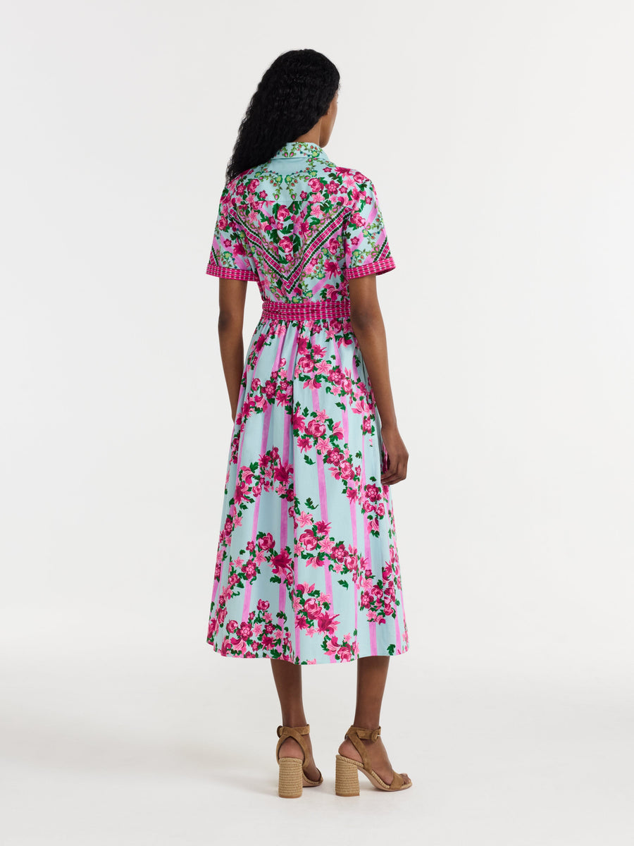 The Vivienne Dress is a classic shirt dress infused with SALONI charm. The geometric fitted bodice and short cuffed sleeves are juxtaposed by a softly gathered skirt adorned with ornamental bellis bouquets. The waist is accentuated by a contrast fuchsia tie. A striking play of structure and movement, it's a stunning piece to wear for summer occasions.