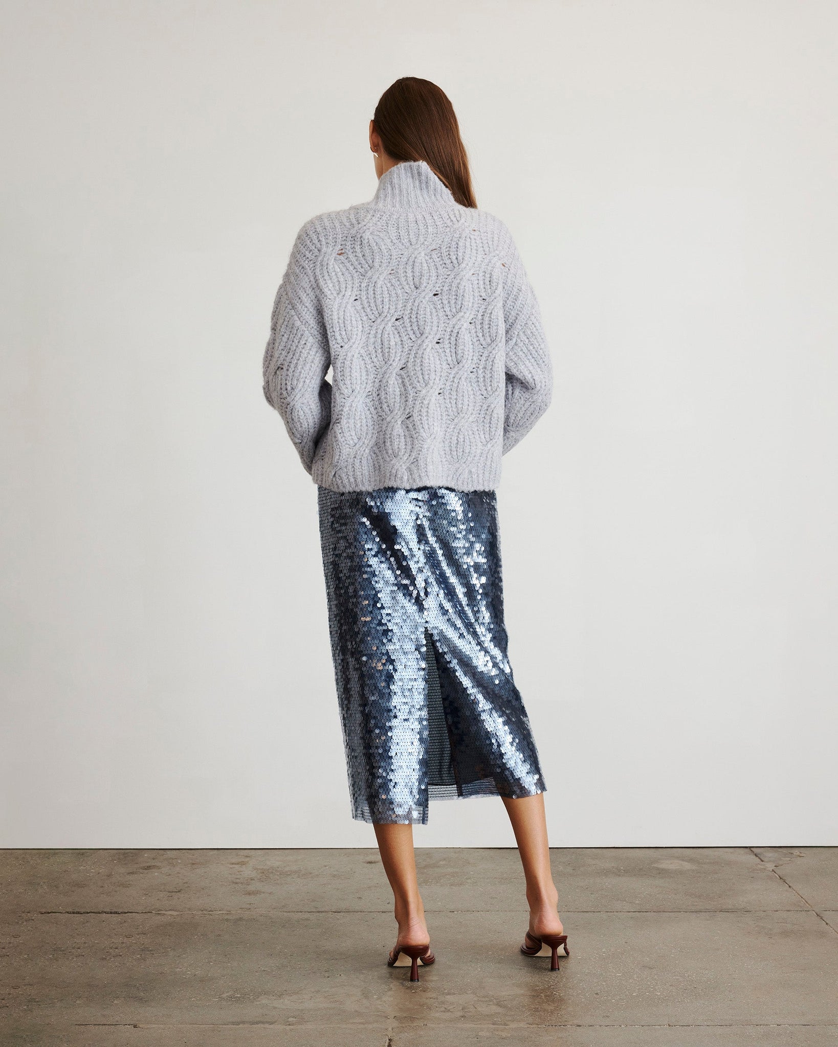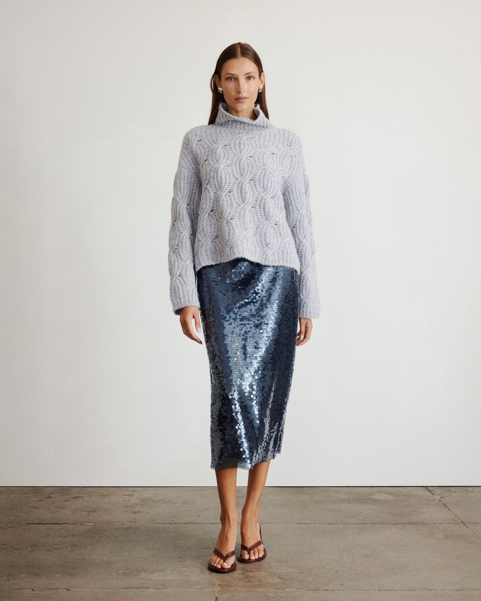 A standout silhouette of the season and a best-selling silhouette, the Kiah Skirt is a sequined midi skirt and our answer to day-to-night dressing this season.