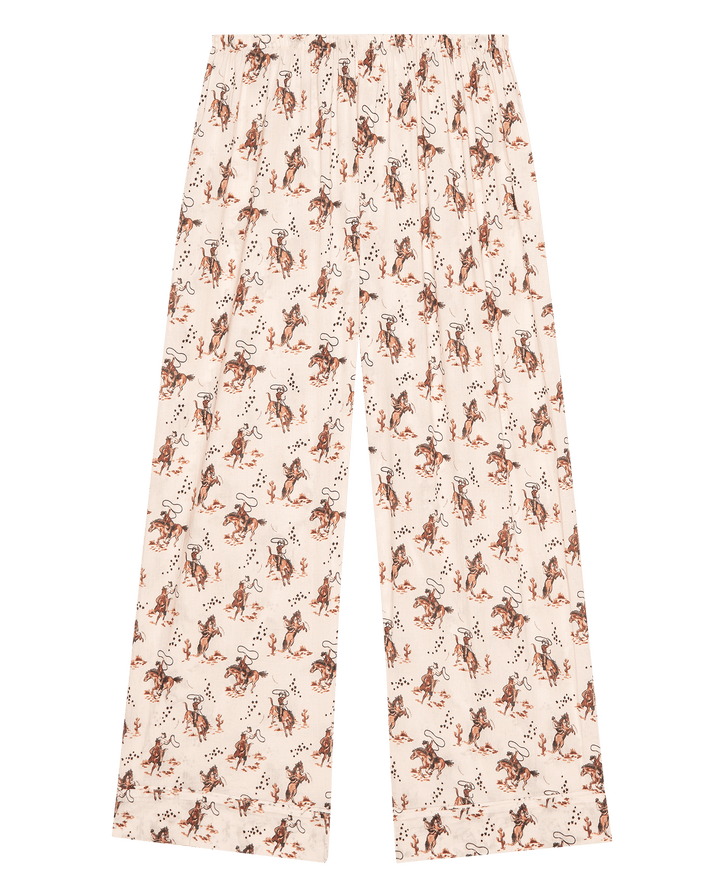 This sleep pant is crafted from the softest 100% cotton in the Western-inspired Cowboy Print. It features a wide leg, slightly dropped rise, an elastic high waist and piped cuff. Wear them with its matching sleep top for mornings at home.