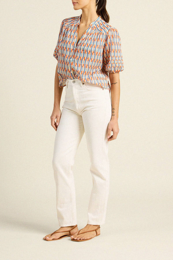 The Loren blouse is a short-puff sleeved blouse with a v-neck opening, buttoned front placket and delicate gathers at the front and back shoulders. Shown here in Retro Grid and made from our soft cotton voile.