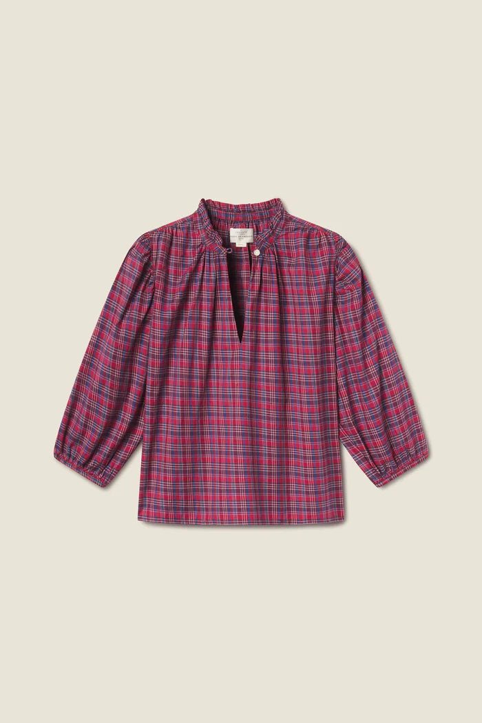 The Orly Blouse is a slightly cropped, billowy blouse with straight bottom hem, split v-neckline and buttoned crown collar. Gathered three-quarter length sleeves finished with delicate bindings. Includes our signature back detail with a gathered waist tab.