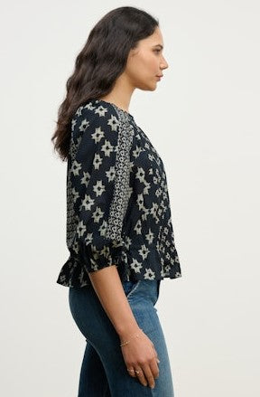 Perfect black and white Velvet top. Love the tie detail on the side and the print. Looks great back to white denim. 3/4 sleeves with cinched waist and ties on the side.